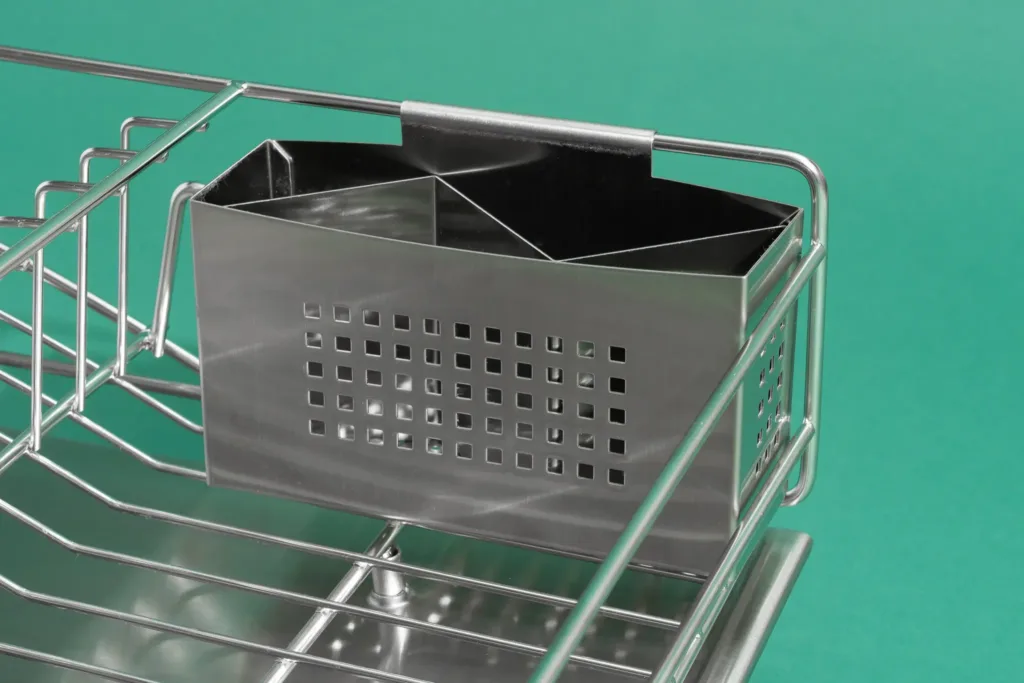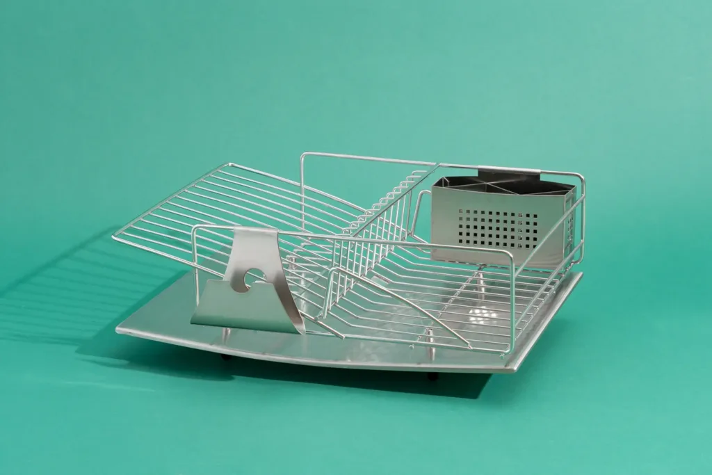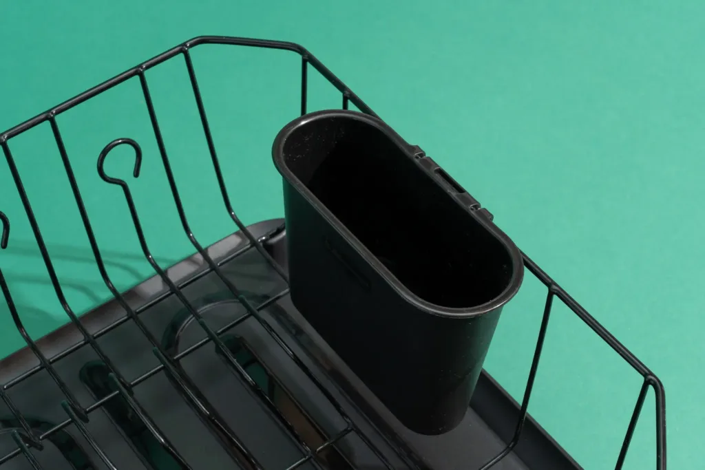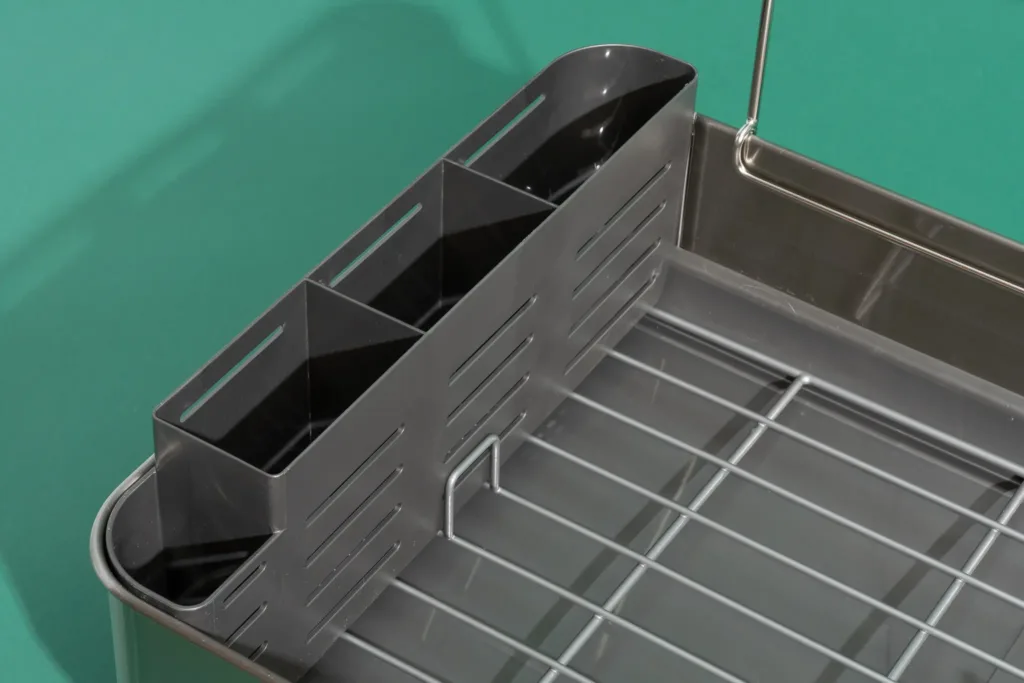 The Zojila Rohan Dish Drainer is a stylish, high-performing option for drying dishes, with enough space for a four-person household. Made of heavy-duty stainless steel, it features a sleek design and solid drain board that allows water to flow quickly into the sink, drying dishes faster than other racks. The utensil caddy is smaller but removable for easier cleaning and can be placed anywhere on the rack. Though expensive, its modern look and efficiency make it a worthwhile choice for those willing to invest in a premium dish rack.
