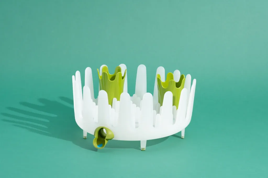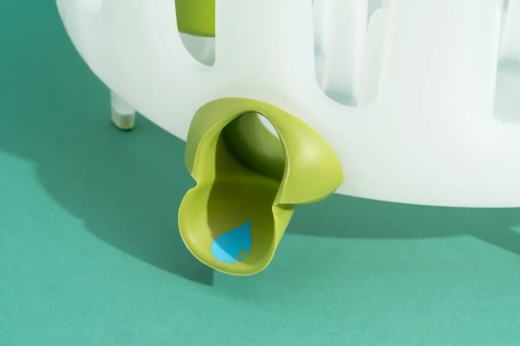 The Chef’n DishGarden includes two removable utensil holders, though they can take up space. Its steeply angled base drains well, and the spout flips up to prevent water leakage when moving. The textured exterior helps prevent suction on glasses. While the prongs may make cleaning trickier, reviews indicate no major complaints about upkeep. Some find it small, as expected from a compact rack, and the design may not appeal to everyone. A common issue is the difficulty in removing sticky labels—adhesive remover may be needed.