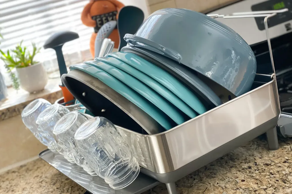 The Simplehuman Steel Frame Dishrack is a sturdy, spacious option ideal for large families or avid cooks, holding even extra-large pots and pans without countertop drips.