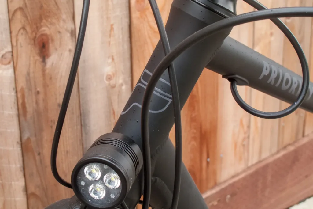 The Continuum Onyx features a dynamo-powered front headlight, so you don’t need to recharge it. The rear light is now also powered by the front hub’s dynamo. The headlight is sufficient for city riding but may need supplementation for darker areas due to a strobe-like effect.