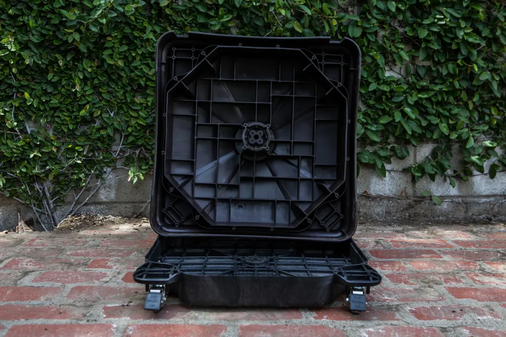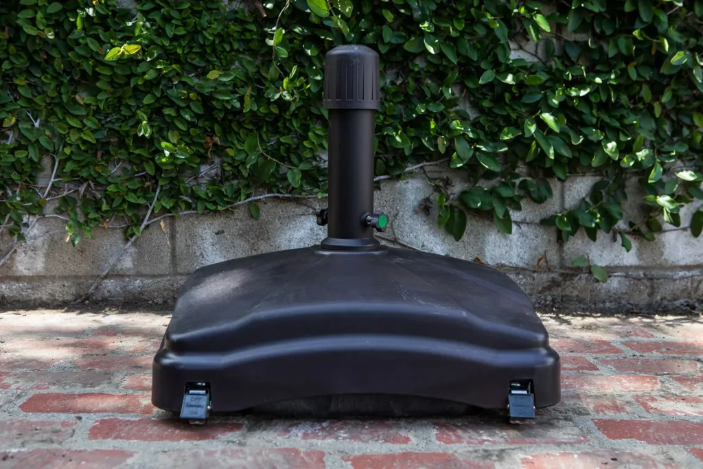 Weighing up to 125 pounds, the Shademobile Rolling Umbrella Base is the heaviest option we tested. While setup is less convenient since you need to fill it yourself and screw it shut, its four wheels make it easy to reposition. The base arrives empty at 22 pounds, and after filling it with sand or bricks, it becomes an extremely stable choice for umbrellas up to 12 feet. However, it’s not recommended for cantilevered umbrellas.
