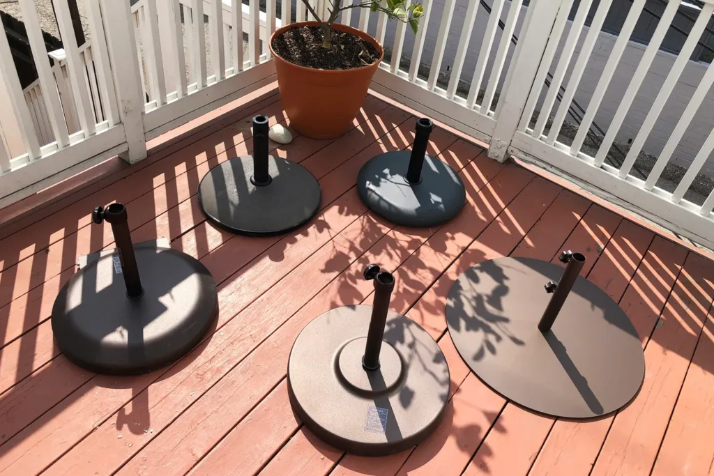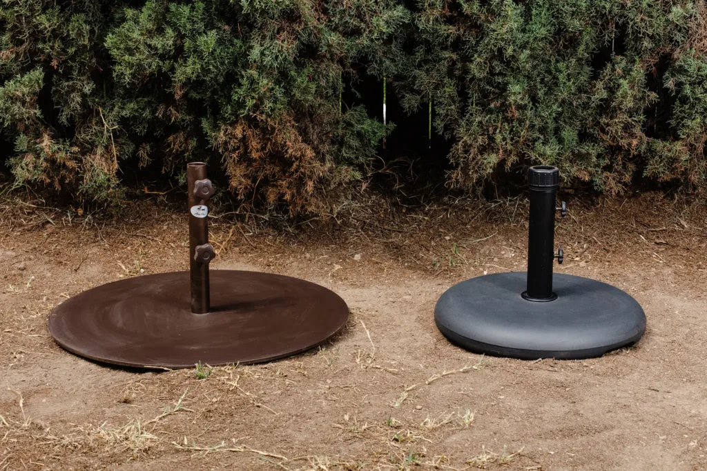 Weight: We recommend bases weighing at least 50 pounds for a 9-foot umbrella with a table, or 75 pounds for umbrellas without tables. For maximum safety, some experts suggest a base weighing 10 times the umbrella’s size (e.g., a 90-pound base for a 9-foot umbrella).